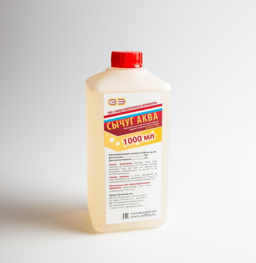 Жидкий Сычуг-Аква 1л — натуральный сычужный фермент животного происхождения в жидкой форме, предназначенный для эффективного свёртывания молока при производстве сыров. Продукт создаётся на основе ферментов из сычуга молодняка крупного рогатого скота и полностью соответствует требованиям ГОСТ и технических регламентов. Норма расхода –  20 мл на 100 литров молока.
